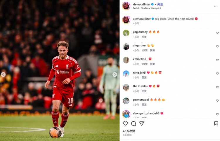 麦卡利斯特也在赛后通过社媒晒出自己的比赛照,并配文:“任务完成!晋级下一轮。”